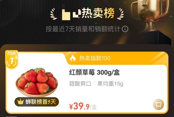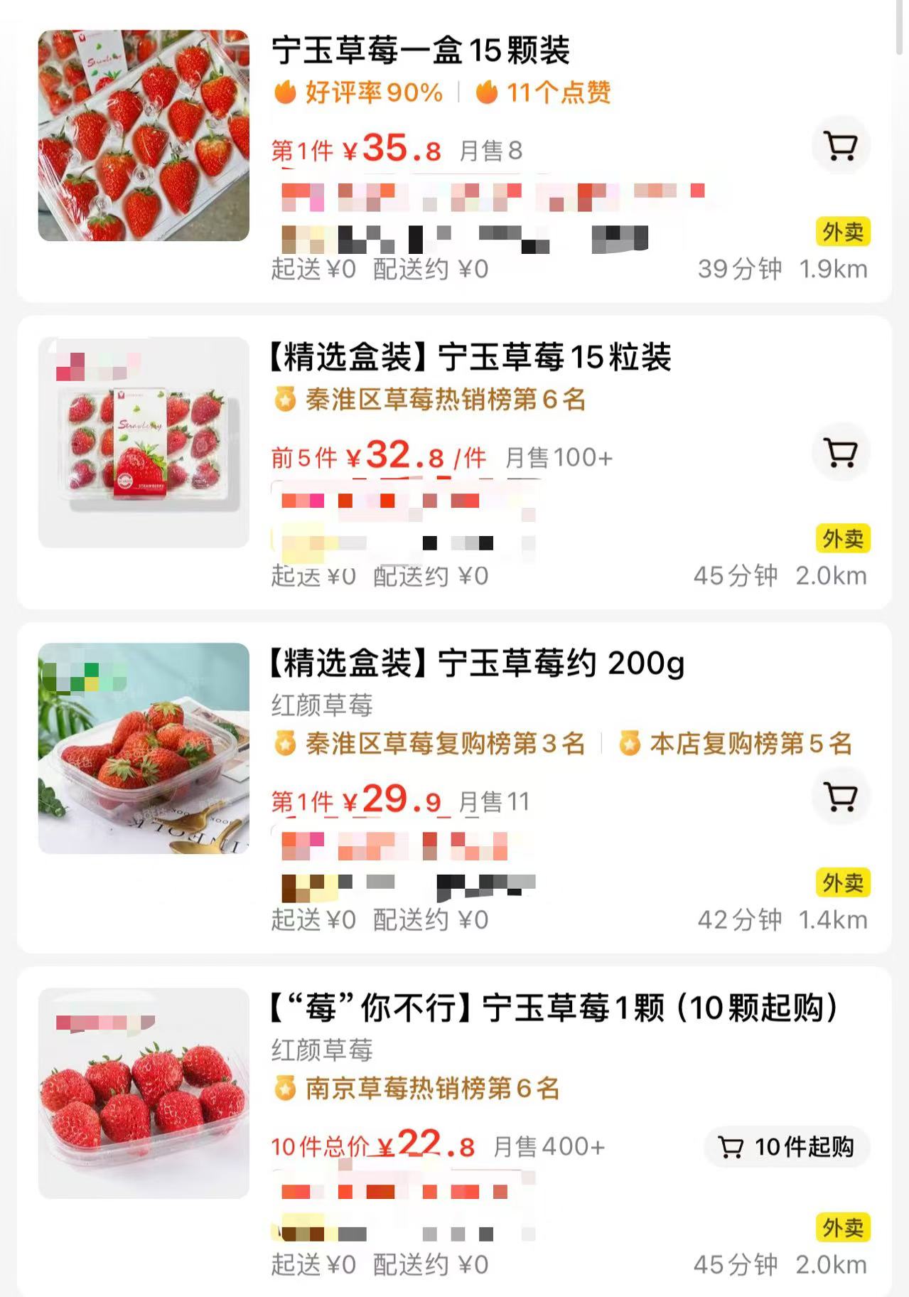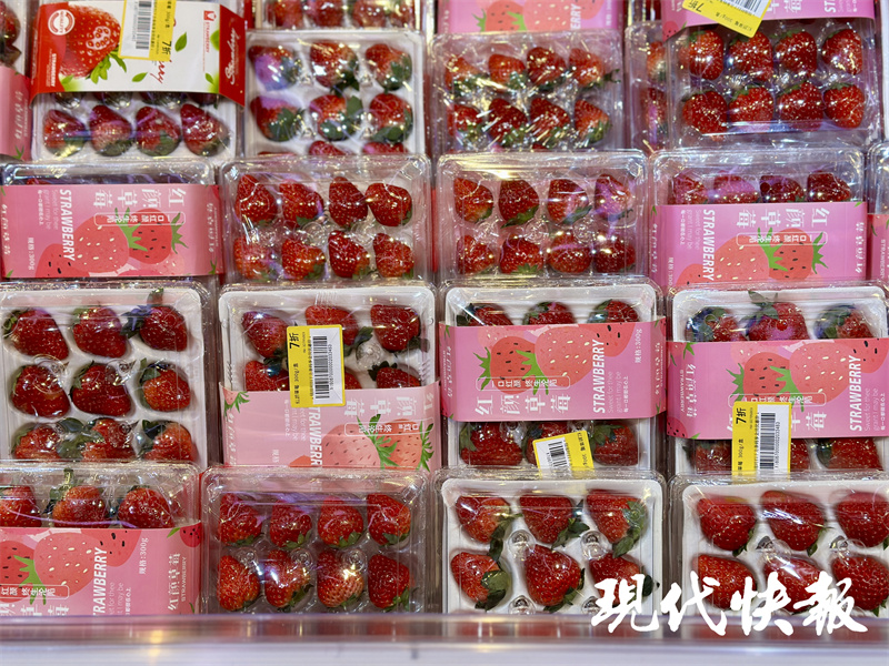 相比水果店,商超里的草莓品种更丰富。在南京秦淮区的一家连锁商超内,记者看到一盒盒鲜艳欲滴的草莓整齐地排列在货架上。产自辽宁丹东的“红颜”草莓一盒300克卖35元,产自山东济南的“章姬”草莓300克卖59.9元……“丹东的‘红颜’草莓还有一斤装的大果,每颗都有20克以上,69.9元一盒,前一天售罄了,还没有补货。”一名商超的工作人员说道。记者看到,在该商超的线上购物平台,草莓已蝉联水果销量飙升榜榜首5天,成为热卖第一名的产品。