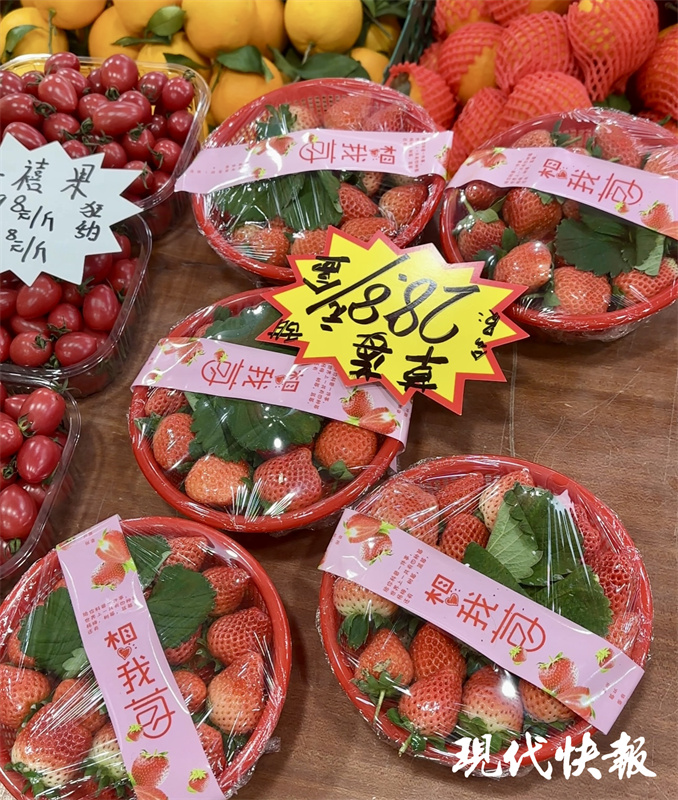 由于草莓本身比较“娇贵”,经不起磕磕碰碰,水果店在售的全部是包装好的草莓,以圆盆装或长方形盒装为主。“这是‘红颜’草莓,最近降价了,一盆卖28.8元,之前要卖到三四十元。”一家水果店老板说道。记者看到,一盆草莓有15个左右,个头不大,连盆一起约1斤重。