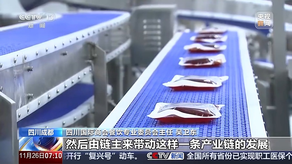 四川省火锅食品供应链发展促进会会长黄成基:川渝地区的底料,辣椒跟花椒加的配方比例要比较大一些。到了东部沿海、北方、南方地区,用的辣椒比例、辣椒品种和花椒品种相对来说比较弱一些,要少一些。从手工炒料到现在的工厂机械化生产,已经完善了从单一的品类到标准化建设和数据化建设,也极大推动了供应链的发展。