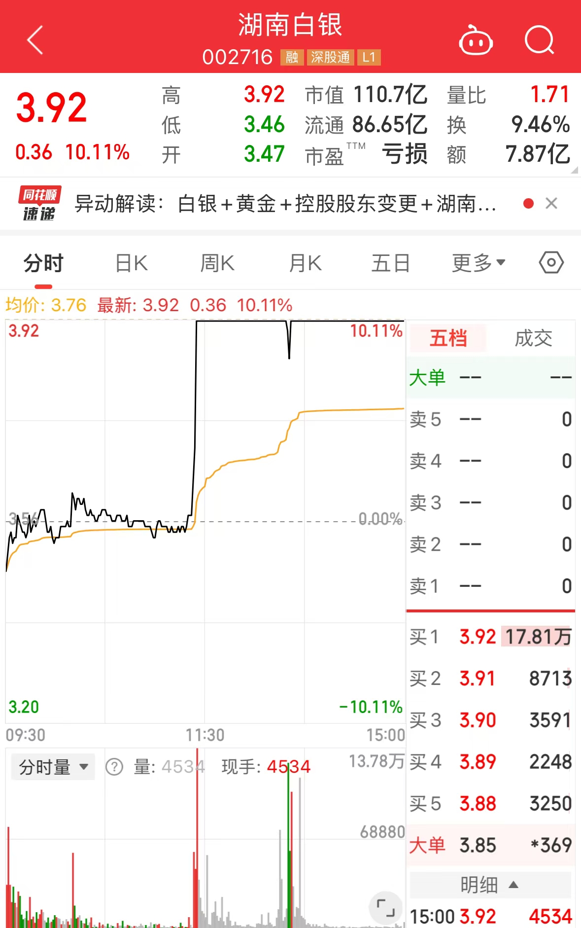 11月26日早盘,湖南白银股价维持在3.55元/股震荡,但在临近午市休盘时,股价突然异动拉升,并在3分钟左右强势封住涨停板。