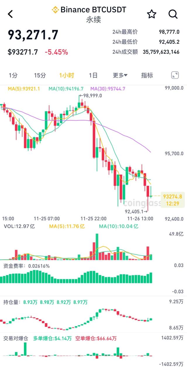 在冲击10万美元未果后,比特币价格掉头向下,一度跌穿93000美元,最低92666美元,走势出现了明显回调。比特币的深幅震荡走势,17.8万人爆仓,金额达5.67亿美元。