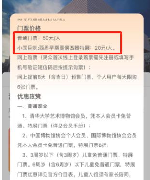 记者在清华艺博网站看到,“小国巨制:西周早期噩侯四器”特展普通门票(即入馆的大门票)50元/人,普展+特展门票70元/人。