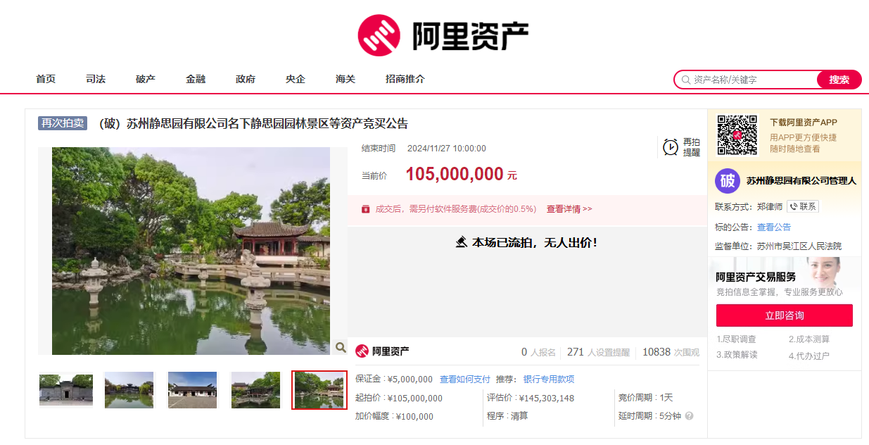 经过24小时竞拍,截至11月27日10时,此次破产拍卖终因无人出价,遭遇流拍的尴尬处境。