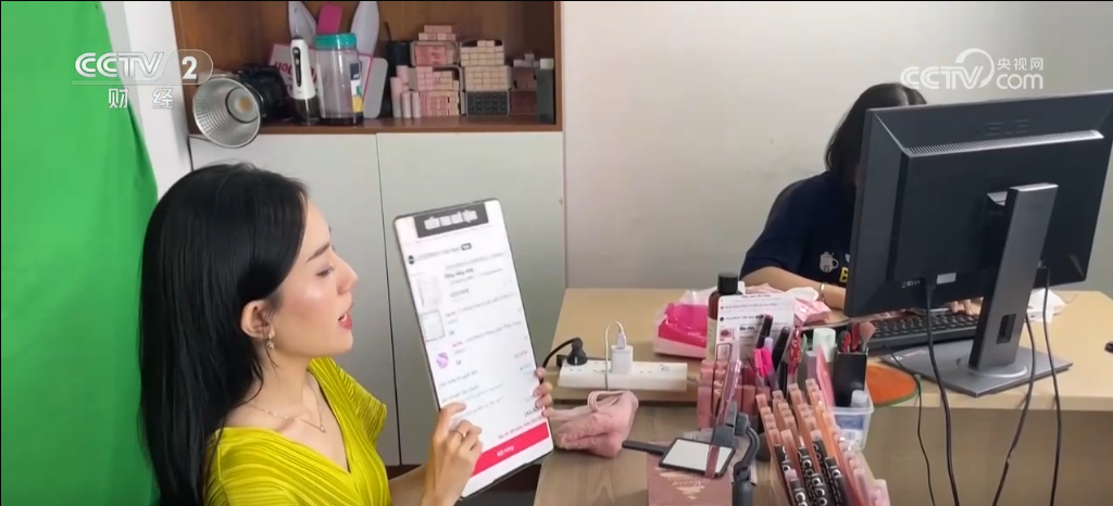 在越南胡志明市一家直播中心,Thuân Anh正卖力地向越南网友介绍一款来自中国企业生产的面膜。大学毕业以后,她偶然间接触到直播电商,开始跟中国企业合作带货,并成为一位美妆达人。她告诉记者,这份直播电商的工作不仅让她的收入提升了不少,还培养了她与公众沟通的能力。