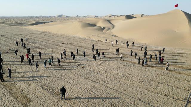 贾存鹏:秋季植树目前我们有防沙治沙涉及的乡镇9个,每天有1万人在植树造林。我们向塔克拉玛干沙漠,特别是绿洲外围进行扩绿增绿,主要是对以前防沙治沙的成果进行巩固,扩大我们的战果。以前是“沙进人退”,我们现在实现了“绿进沙退”。在治沙的过程中,我们进行了灌药结合、乔灌结合、乔药结合,在红柳、梭梭中间套种板蓝根、甘草等适合本地的一些中药材,还有梭梭、红柳和酸枣套种。地下是肉苁蓉的经济收入,树上有酸枣的经济收入,实现“双层经济收入”。