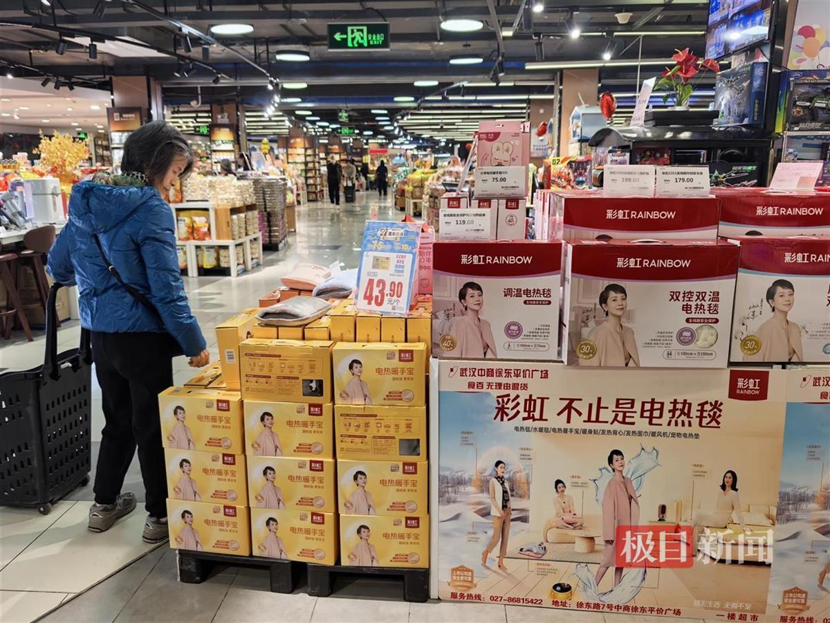 11月28日,在武汉中商徐东平价广场,秋冬保暖、取暖用品分多区域摆放。暖风机、小太阳电暖器等取暖设备摆放在过道转角处;对面就是益母草暖腹贴、艾草暖宝宝、电热水袋、水暖毯等取暖用品;超市入口处则摆放着帽子、围巾、手套等保暖用品,不少顾客驻足保暖用品区选购。