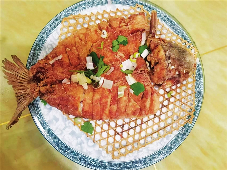 “来条烤鱼!”跑堂的小伙朝后厨吆喝道。不同于常见的烤鱼连烤带炖还能涮菜,小高饭铺的烤鱼做法更“江湖”。一条一公斤多的草鱼洗净去骨改花刀,芹菜丁等七八种鲜料剁碎成末,再加上四五种调料一并在鱼身涂抹均匀,最后一味特殊的秘方,便是时间。经过24小时的腌制入味,在两挡高温的轮番烘烤下,一尾色泽金黄的烤鱼用竹网盛着端上桌,食之味道鲜嫩奇香,原汁原味,急火猛烹,一如快意人生。