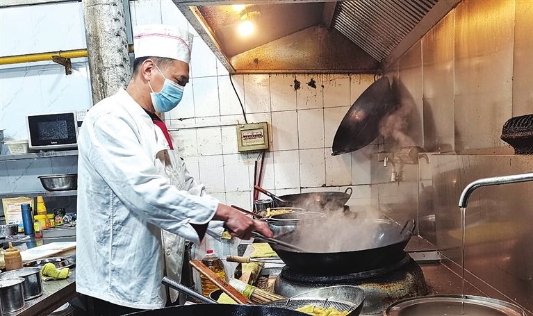 走进面积为百余平方米的店面,十多张桌子摆放得整整齐齐。正赶上饭点,客人越来越多。虽然后厨配菜、炒菜加前厅跑堂有6个人,但老板高东荣闲不住,一会儿在后厨搭把手,一会儿又到前厅传个菜,妻子景春艳也打着下手兼顾收银。自制皮冻、糖醋丸子、干炸蘑菇、豆角茄子、烤馍炒凉粉……没有花里胡哨的菜名,熟悉的饭菜带着家常味道,传递出时光里的市井气息。