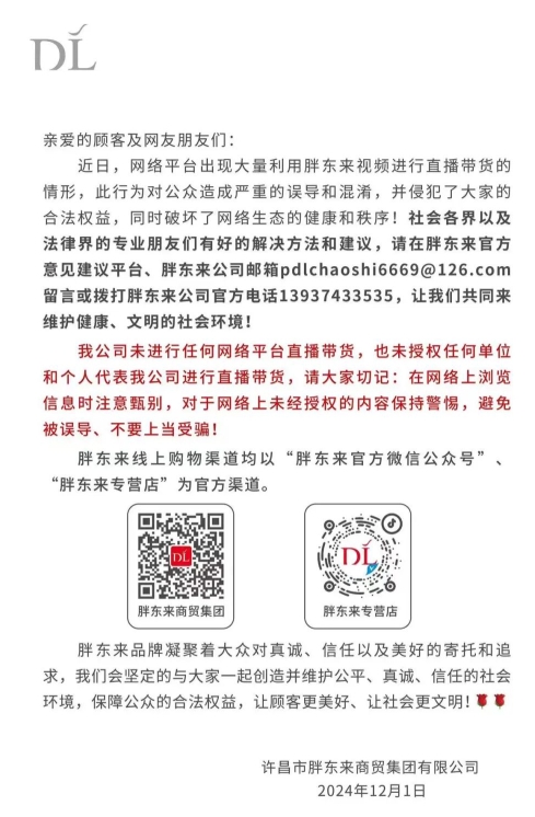 许昌市胖东来商贸集团未进行任何网络平台直播带货,也未授权任何单位和个人代表该公司进行直播带货,请大家切记:在网络上浏览信息时注意甄别,对于网络上未经授权的内容保持警惕,避免被误导、不要上当受骗!