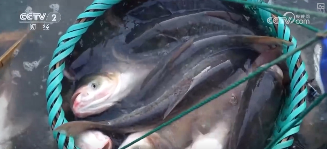 村民介绍,水域的鱼主要是花鲢和白鲢,一天能收获两万斤左右。鱼笼装满后,岸上的吊车就将鱼笼吊送到一旁的水产车上。