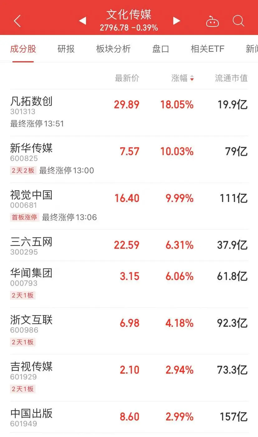 文化传媒午后展开反弹,凡拓数创涨超18%,视觉中国、新华传媒涨停。