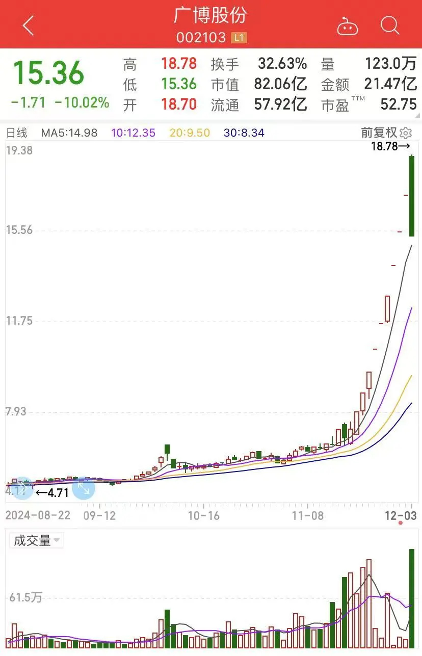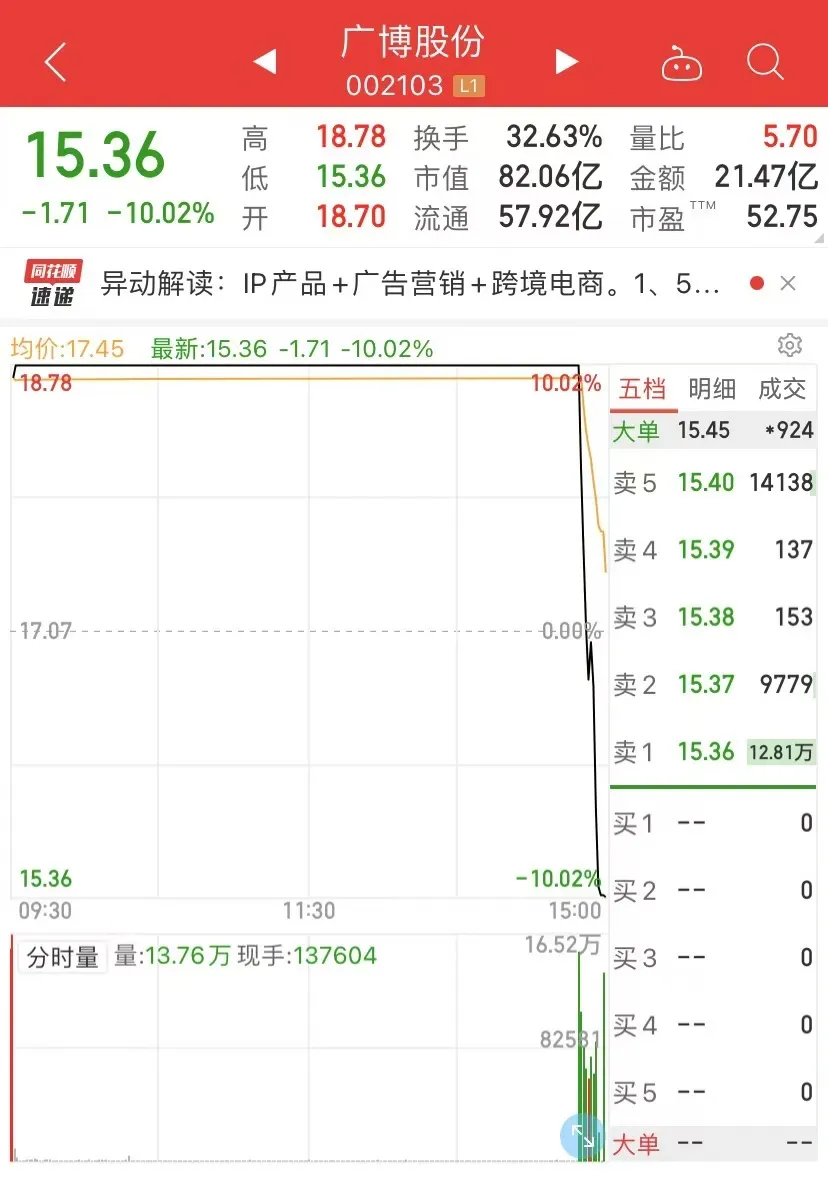 14时50分许,广博股份、华胜天成等高位股纷纷炸板大幅跳水。广博股份上演“天地板”。此前,广博股份走出了9连板。