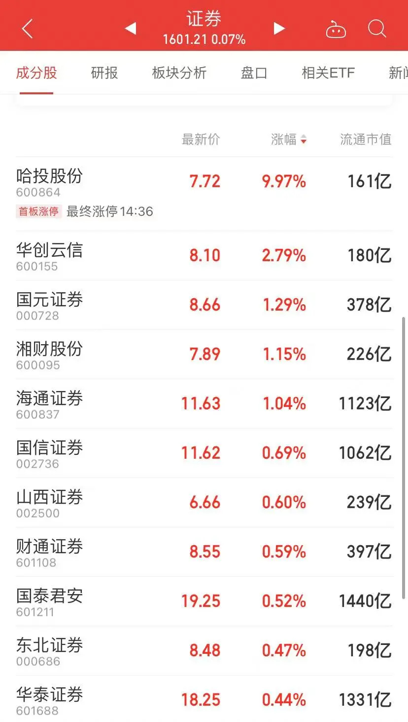 证券板块午后快速拉升,哈投股份涨超6%,国元证券、华创云信跟涨。