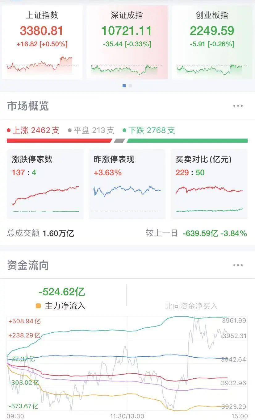 截至目前,沪深京三市上涨个股2462只,涨停137只,下跌个股2768只,跌停4只。沪深京三市成交额突破1.6万亿元,其中沪市成交额6300亿元,深市成交额9471亿元,北证50成交额362亿元。
