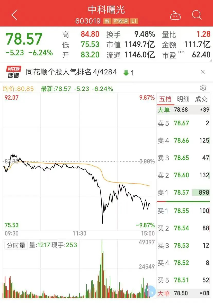 中科曙光盘中跳水,截至发稿跌超6%,成交额超110亿元,中国长城、浪潮信息等纷纷跟跌。