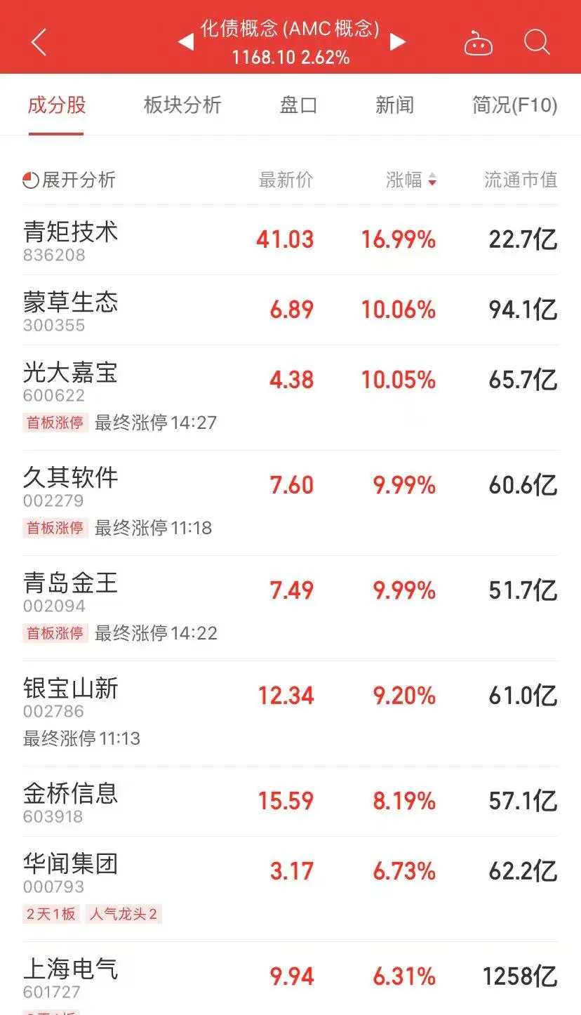 化债概念午后异动,青矩技术涨17%,光大嘉宝直线涨停,青岛金王、久其软件触及涨停,蒙草生态、金桥信息跟涨。