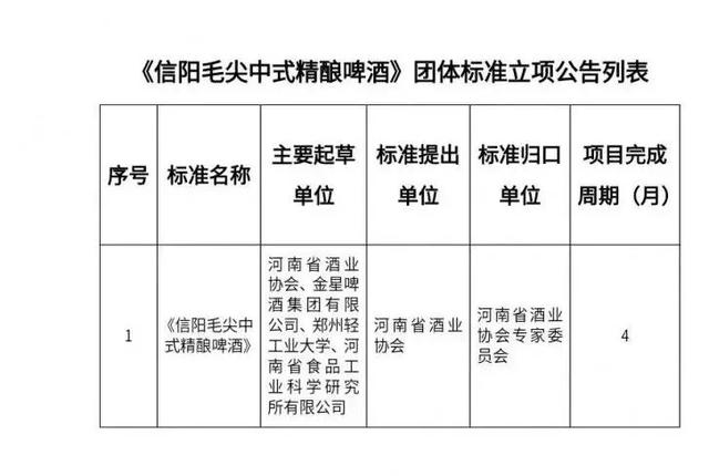 大河财立方记者注意到,与信阳市茶叶协会发布《公告》同一天,河南省酒业协会发布一则《关于<信阳毛尖中式精酿啤酒>团体标准立项公告的通知》,批准了《信阳毛尖中式精酿啤酒》团体标准并予以立项,金星啤酒集团有限公司是起草单位之一。