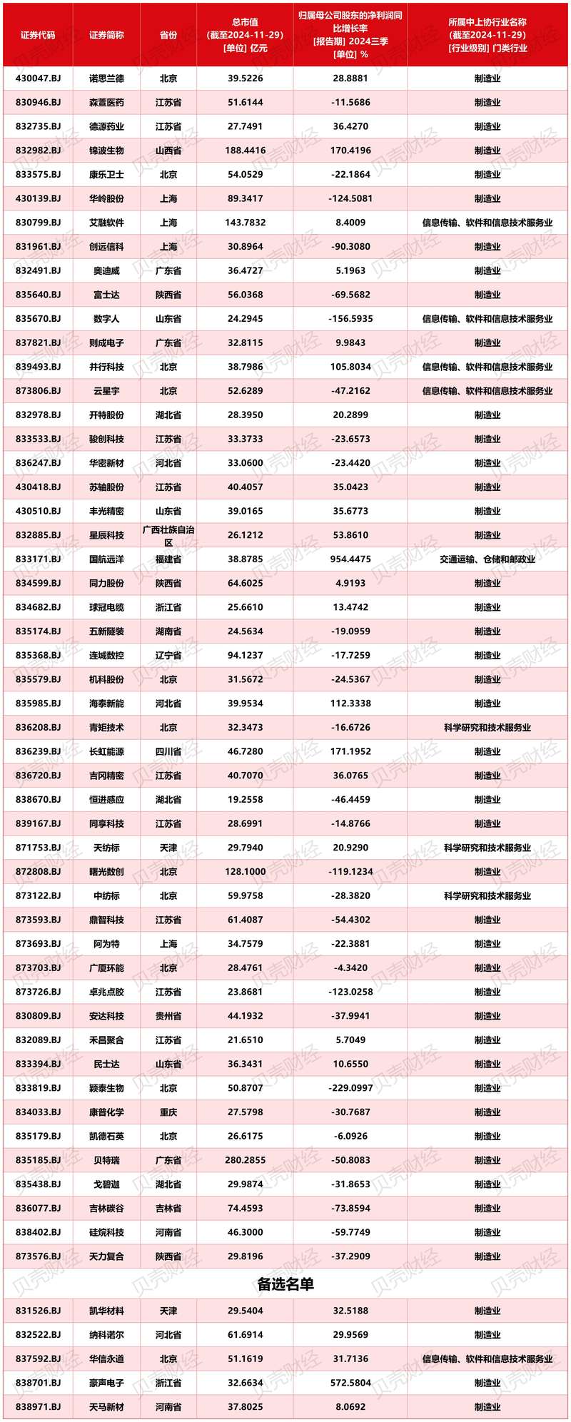 同时,国航远洋(833171.BJ)、长虹能源(836239.BJ)及锦波生物(832982.BJ)等前三季度在归母净利润同比增速上表现抢眼的公司,也因其高成长性的特点,保持在北证50成份股名单中。