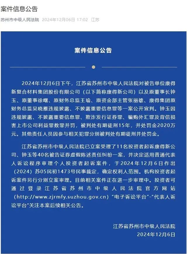据苏州中院消息,2024年12月6日下午,该院对被告单位康得新复合材料集团股份有限公司(以下简称康得新公司)以及原董事长钟玉、原董事徐曙、原财务总监王瑜、原资金部主管张丽雄、康得集团原财务总监吴晓雁违规披露、不披露重要信息罪等一案公开宣判。钟玉因违规披露、不披露重要信息罪、欺诈发行证券罪、骗购外汇罪及背信损害上市公司利益罪数罪并罚,被判处有期徒刑15年,并处罚金2020万元。其他责任人员因参与相关犯罪分别被判处有期徒刑并处罚金。