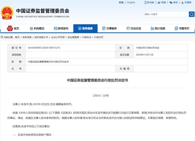 近日,证监会披露一则行政处罚决定书,因先后操控23只股票的交易价格和交易量,朱泽宇被合计罚没近3500万元。