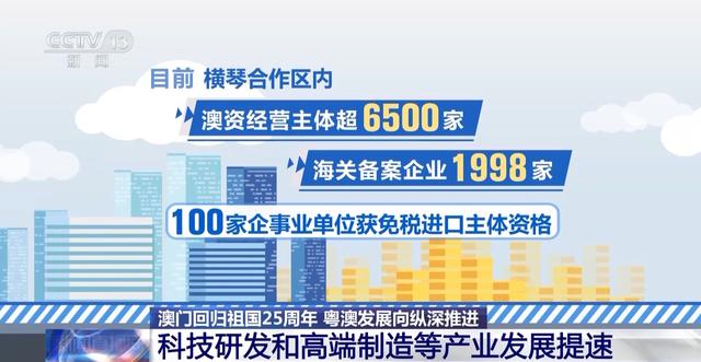 目前,横琴合作区内澳资经营主体超6500家、海关备案企业1998家,100家企事业单位获免税进口主体资格,合作区大力发展的科技研发和高端制造等“四新”产业发展提速增效,服务澳门经济适度多元发展的效果加速显现。