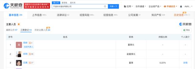 天眼查App显示,近日,杉杉股份(600884)发生工商变更,郑驹卸任法定代表人、董事长,改任副董事长,由周婷任法定代表人、董事长。宁波杉杉股份有限公司成立于1992年12月,注册资本约22.6亿人民币,经营范围含电子专用材料销售、光电子器件销售、石墨及碳素制品销售、以自有资金从事投资活动等,由杉杉集团有限公司、宁波朋泽贸易有限公司、宁波市鄞州捷伦投资有限公司等共同持股。此前,杉杉股份发布公告称,鉴于郑驹先生因工作原因申请辞去公司董事长职务,公司董事会现选举董事周婷女士为公司第十一届董事会董事长。鉴于庄巍先生因个人原因申请辞去公司副董事长职务,公司董事会现选举董事郑驹先生为公司第十一届董事会副董事长。