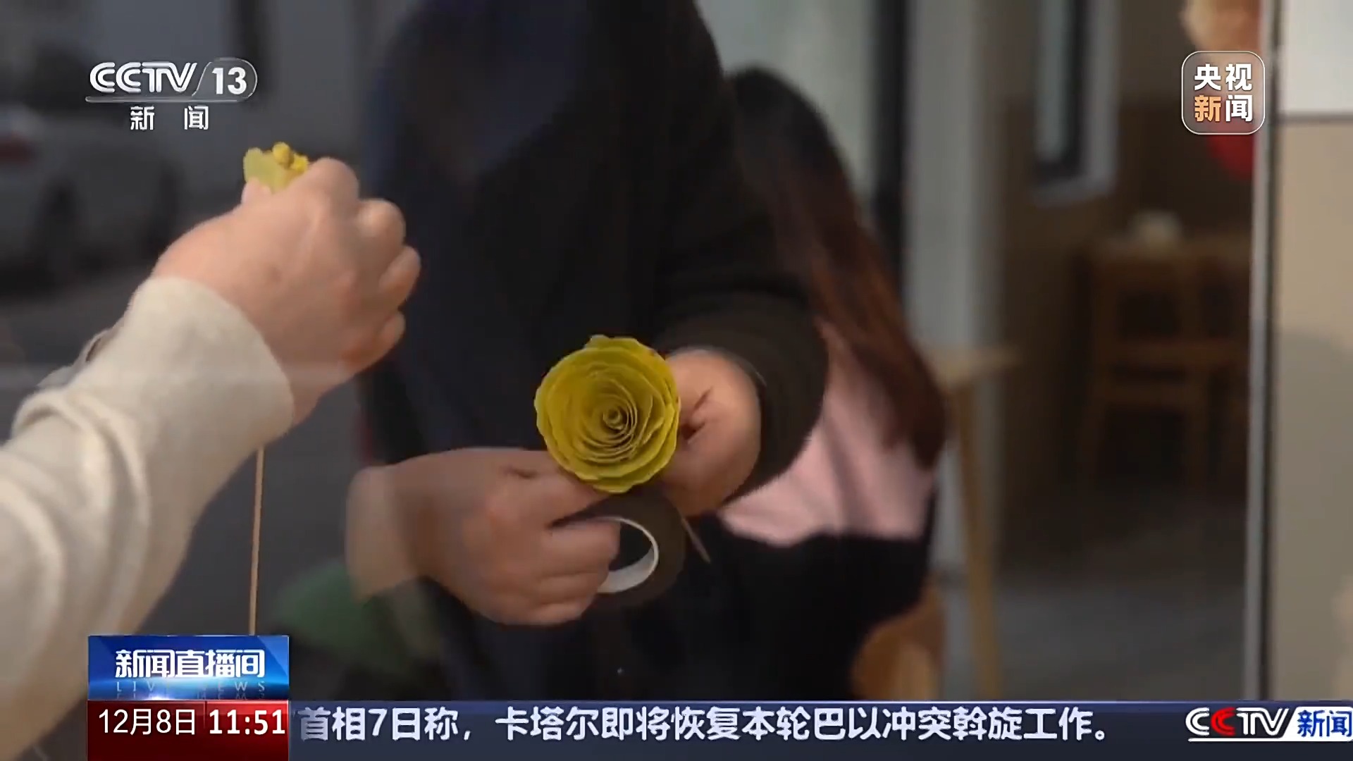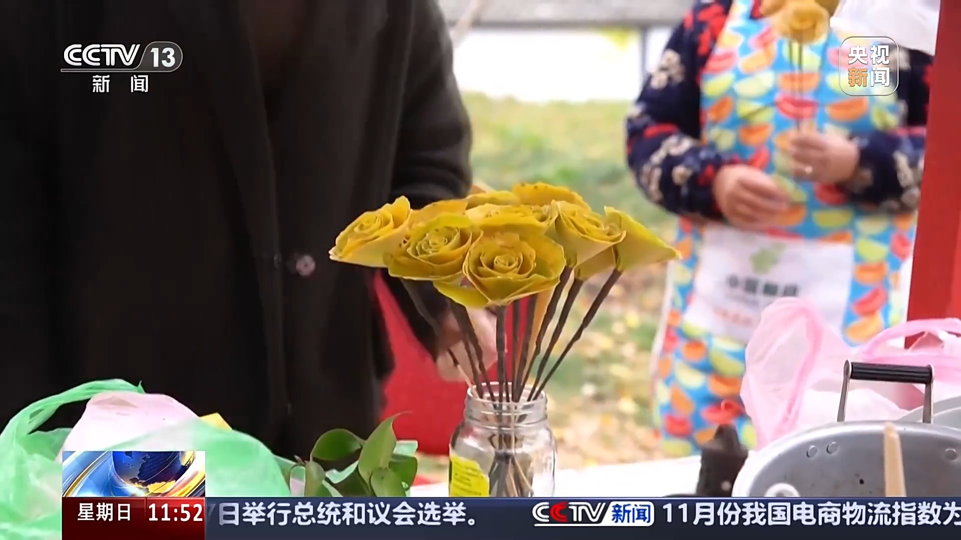 在长兴县小浦镇的“十里古银杏长廊”景区,村民周永新正在教村里的姐妹们制作银杏叶花束。在她的巧手之下,从地上捡拾的银杏落叶,被一层层粘到竹签上,慢慢拼凑出花朵的模样。