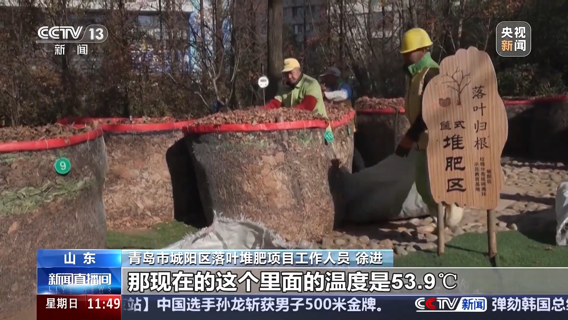 山东省青岛市城阳区落叶堆肥项目工作人员 徐进:这个堆肥筐是有孔的,它是为了让氧气进来,然后它这里边就有大量的耗氧微生物,现在的这个里面的温度是53.9℃,它已经开始大量繁殖了,冬季的时候我们到60天到90天,它就可以变成那种黑色的黑金土肥料。