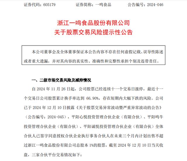 一鸣食品表示,自2024年11月26日起,公司股票已经连续十一个交易日涨停,最近十一个交易日公司股票累计换手率达到66.90%,存在短期内大幅下跌的风险。公司已于2024年12月10日披露《关于股票交易异常波动暨严重异常波动的公告》,平阳心悦投资管理合伙企业(有限合伙)、平阳鸣牛投资管理合伙企业(有限合伙)、平阳诚悦投资管理合伙企业(有限合伙)全体合伙人已签字同意授权合伙企业执行事务合伙人在未来三个月内计划出售不超过浙江一鸣食品股份有限公司总股本1%的股票,截至2024年12月10日当天收盘,三家合伙平台今日减持13.82万股。