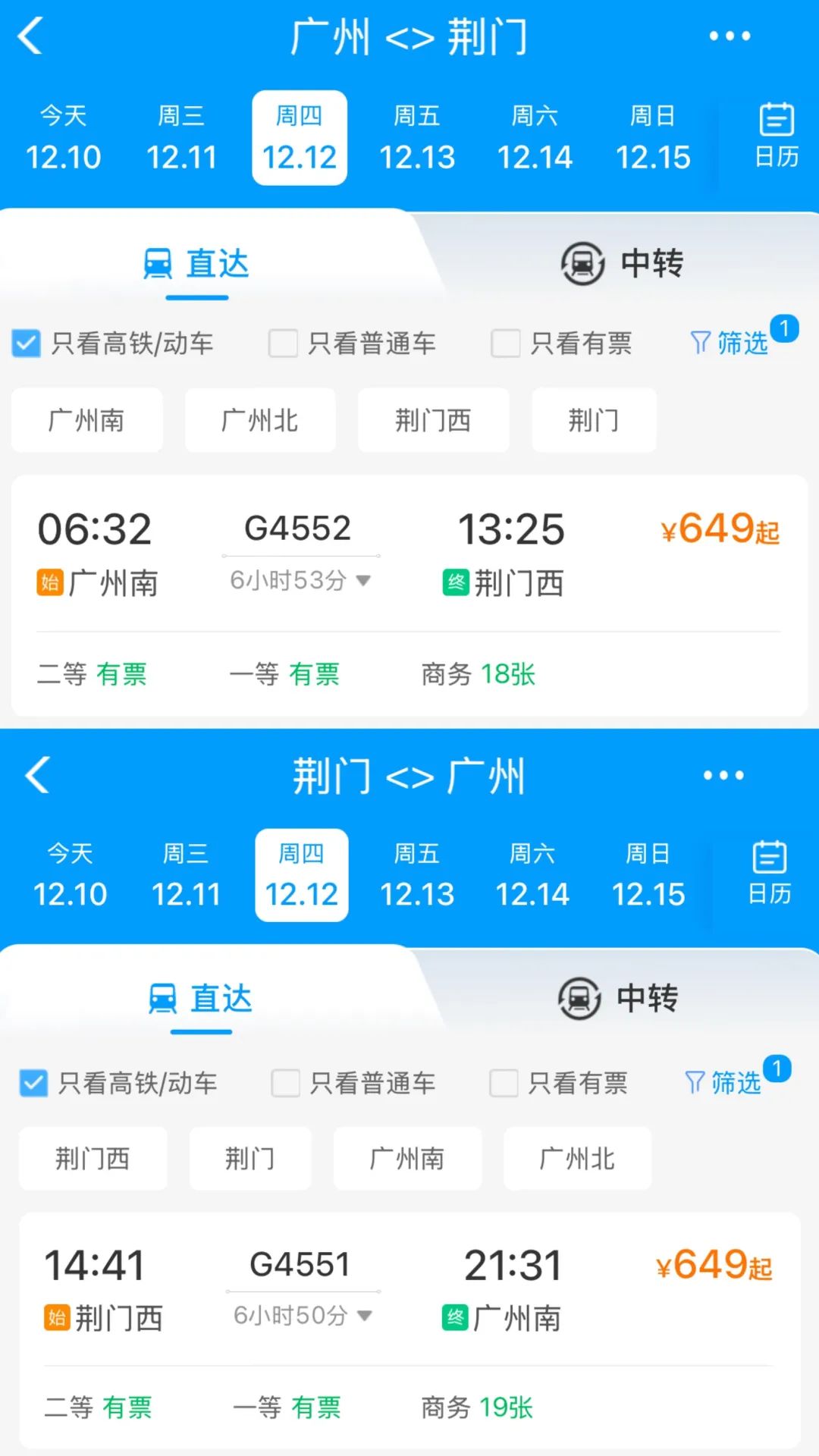 12月8日,荆荆高铁正式开通运营;12月9日,广州至荆门的首趟直达高铁G4552于6:32准时从广州南发车至荆门西。