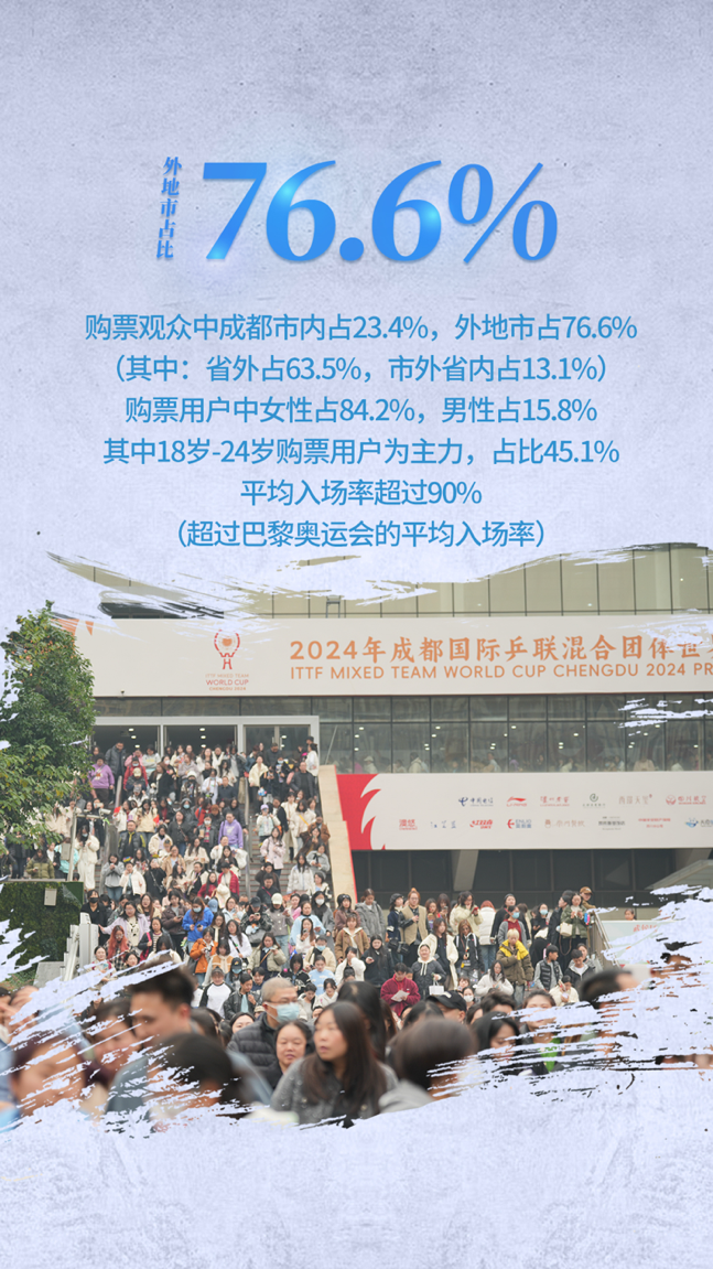 本次比赛购票用户中女性占84.2%,男性占15.8%。仅有23.4%的用户来自于成都本地,外地市用户占比76.6%,其中,13.1%的用户来自于四川其他城市,而从外省市来到成都观赛的用户比例高达63.5%。来自长沙的28岁幼师杨菊红,最喜欢的球星是王曼昱和林高远,“我买了12月2日全天比赛的票,专门请了一天假来给中国队加油。”
