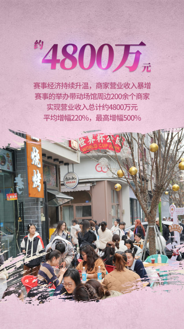 其中,赛事的举办带动场馆周边200余个商家实现营业收入总计约4800万元,平均增幅220%。比如,瑞幸咖啡(玉林东路店)日均售卖1500杯,是开赛前一周日均300杯的5倍;酒辻商店日均营业额1.1万元,比开赛前一周日均额增加200%;唐叔叔麻辣烫营业面积20余平方米,黄金周期间日均营业额1.4万元,比开赛前一周日均营业额增加500%。酒辻商店负责人表示:“平时我们的客流量集中在中午和下午,比赛开始后,早上的游客也明显多了起来。”
