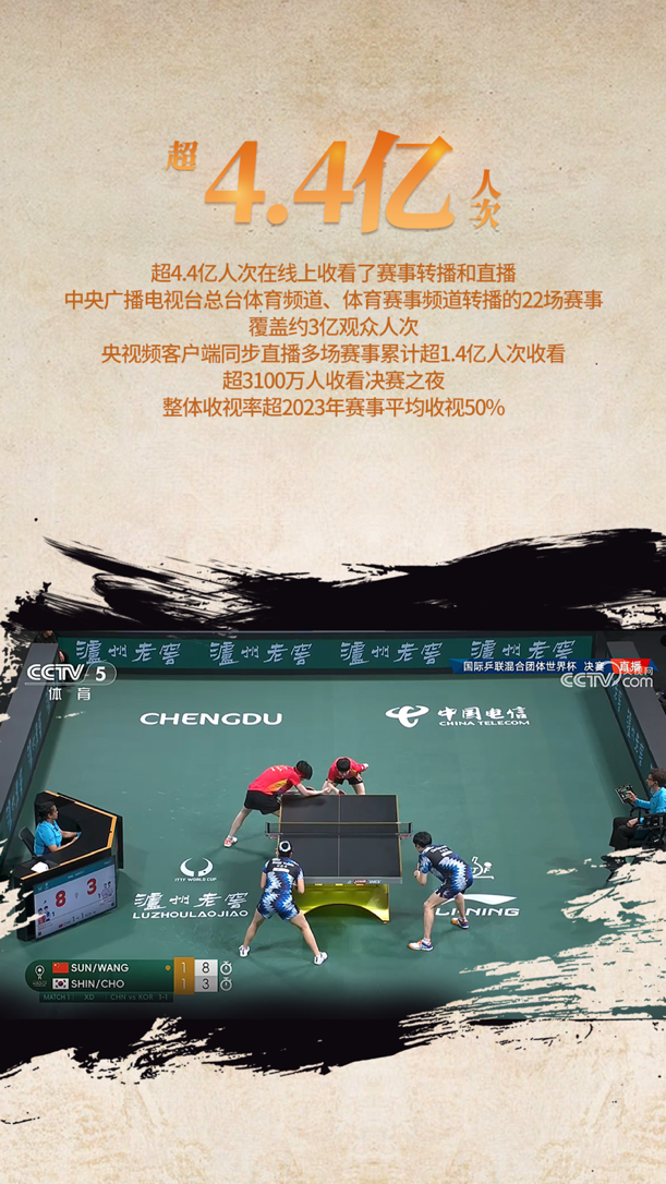 线下消费场景火热,线上乒坛盛宴也锁定了亿万观众目光。据统计,超4.4亿人次在线上收看了赛事转播和直播。中央广播电视台总台体育频道、体育赛事频道转播的22场赛事覆盖约3亿观众人次,央视频客户端同步直播多场赛事累计超1.4亿人次收看,超3100万人收看决赛之夜,整体收视率超2023年赛事平均收视50%。