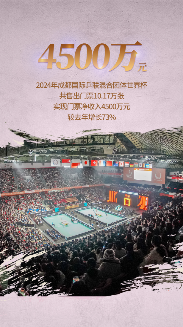 根据赛事门票售卖平台大麦网提供的数据统计,2024年成都国际乒联混团世界杯共售出门票10.17万张,实现门票净收入4500万元,较去年增长73%。