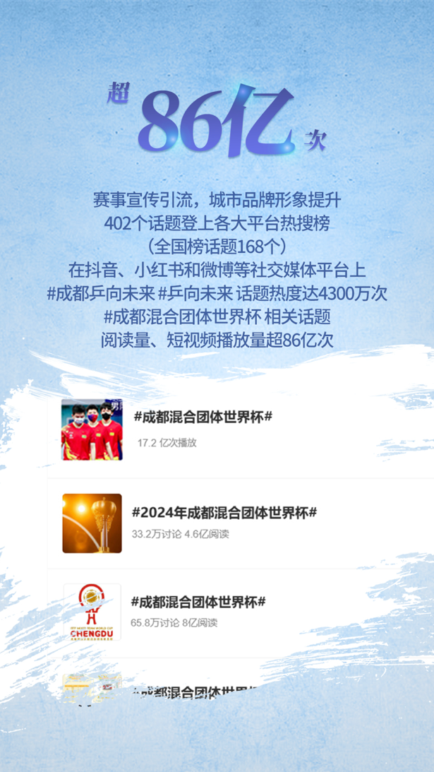 顶级的赛事值得顶级的关注。整个赛事期间,中央广播电视总台、新华社、人民网等央级媒体以及四川观察、成都发布、Gochengdu、运动成都等省市级媒体高度关注,各种报道内容累计1690余条,综合热度2.6亿。在社交媒体平台上,网友们“打卡成都混团世界杯公园”“见着国乒蓝色混双战袍了”“明年成都再见”之类的打卡照片和短视频数不胜数。402个相关话题登上各大社交媒体平台热搜榜,#成都乒向未来相关话题热度达4300万次,#成都混合团体世界杯相关话题阅读量、短视频播放量高达86亿次,彻底引爆网络。