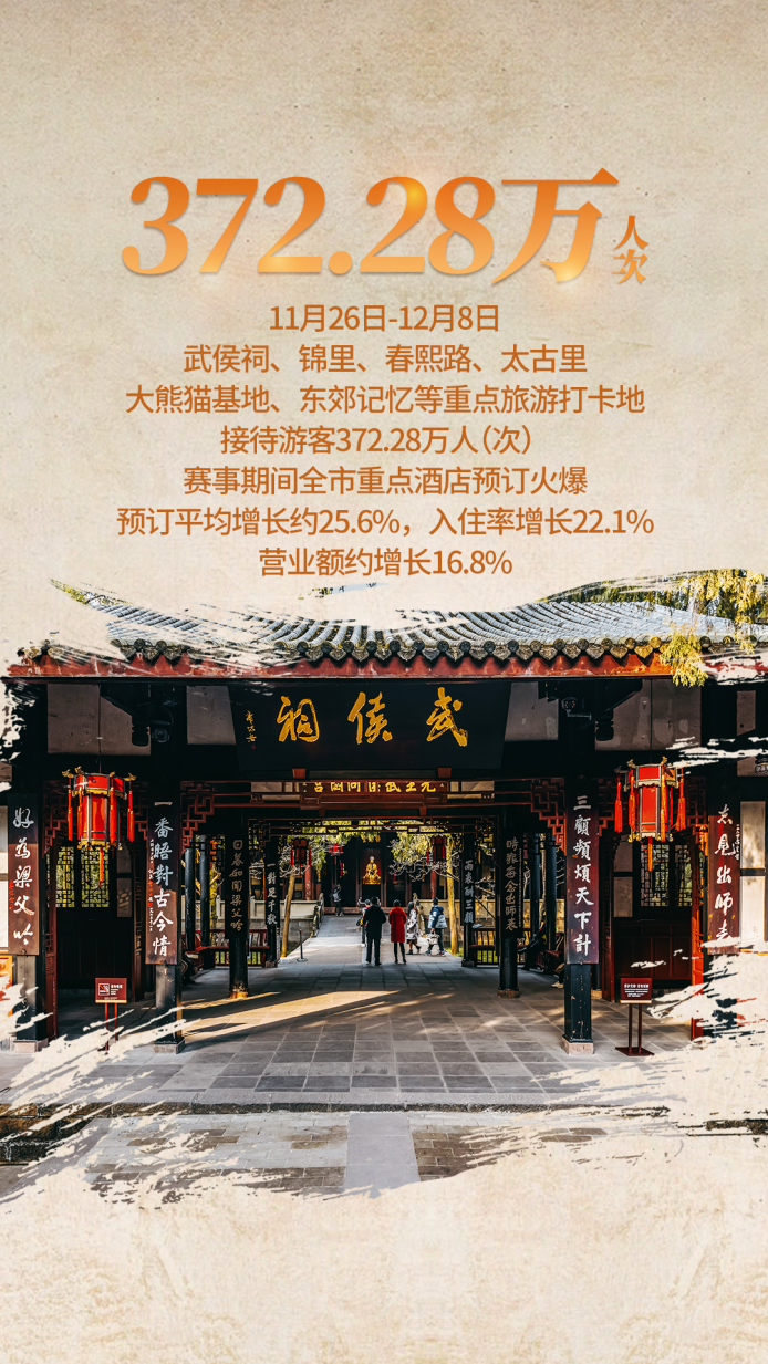 跟随更多外地游客而来的,还有酒店预定的大幅增长。比赛期间,全市重点酒店预定火爆,预订平均增长约25.6%,入住率增长22.1%,营业额约增长16.8%。“一日观赛,多日停留”是不少球迷的选择。从小练球的吴林桦今年19岁,专程从深圳赶来,她从巴黎奥运会迷上了孙颖莎和王楚钦。她计划在成都待9天,3天看比赛,剩下的时间好好游览成都。这些“跟着赛事游成都”的球迷,也带来了对成都文旅产业的提升。11月26日-12月8日期间,武侯祠锦里、春熙路太古里、大熊猫基地、东郊记忆等重点旅游打卡地接待游客372.28万人次。