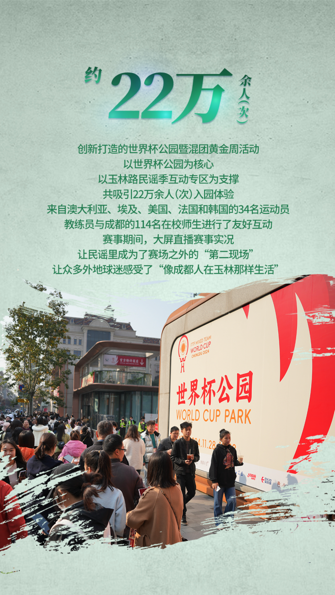 走出只能容纳数千人的球馆,组委会试图在场馆外让更多人感受到赛事氛围和城市文化。国际乒联集团及WTT世界乒联首席执行官史蒂夫·丹顿感叹:“世界杯公园可以让更多人体验到成都的文化、乒乓球的文化,这个是很重要的事。”据统计,从11月28日正式开放至全部比赛结束,世界杯公园入园人流合计约22万余人次,为球迷、市民发放集章纪念明信片3.32万张,发放1.98万份礼品。在世界杯公园的主会场——民谣里互动专区,主办方联动“玉林路民谣音乐季”IP,在赛事期间进行了“乒向未来”开放麦、民谣演唱等音乐活动。赛事期间,大屏直播赛事实况,更是座无虚席,让民谣里成为了赛场之外的“第二现场”,更让众多外地球迷感受了什么是“像成都人在玉林那样生活”。