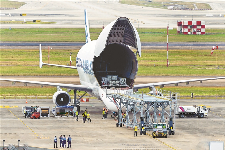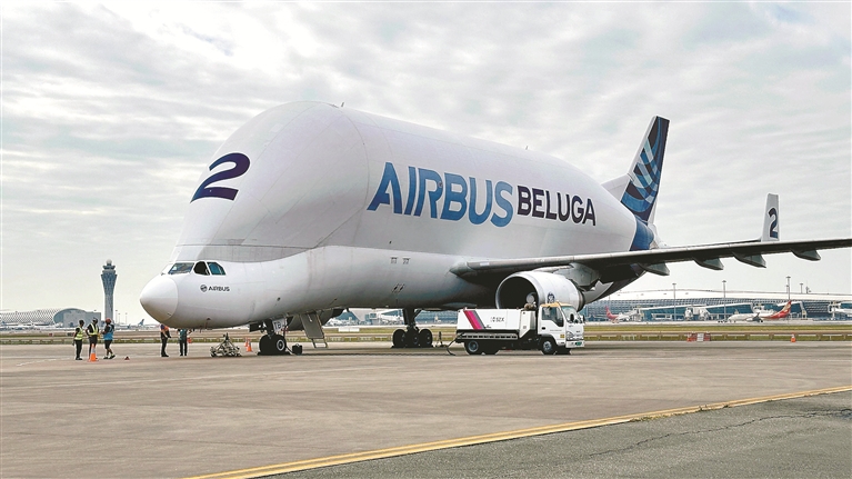 空客“大白鲸”运输机(A300-600ST)是世界现役最大货机之一,采用独特的机头装卸方式。 深圳特区报记者 刘羽洁 通讯员 刘韶滨 摄