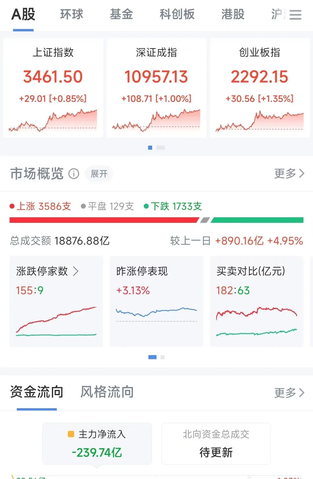 12月12日,A股午后震荡走高,创业板指领涨。截至收盘,沪指报3461.50点,涨0.85%;深成指报10957.13点,涨1%;创指报2292.15点,涨1.35%。总体来看,个股涨多跌少,上涨个股超3500只。成交总额超1.8万亿元,较昨日增加890亿元。