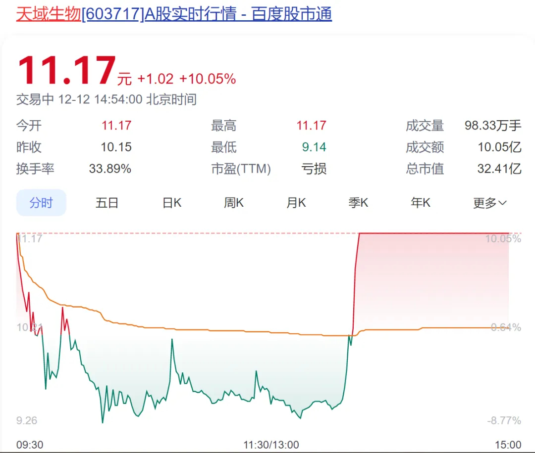 午后天域生物直线拉升涨停,上演准“天地天”行情,成交近10亿元。该股此前走出4连板,今早以涨停开盘,此后一度跳水逼近跌停。