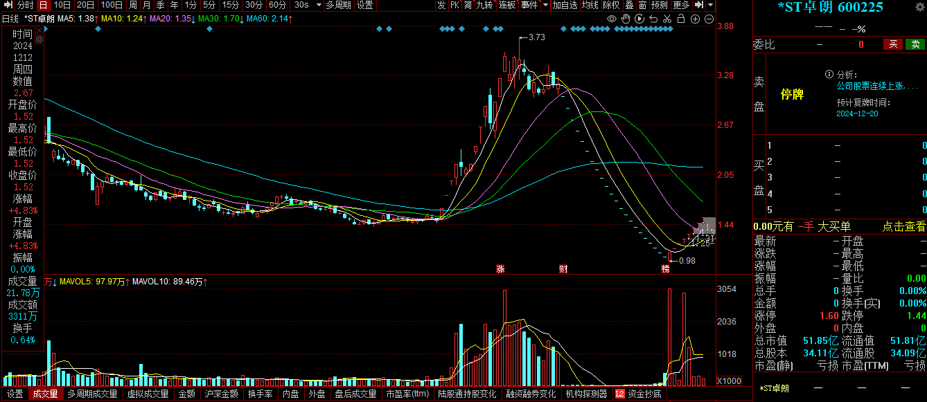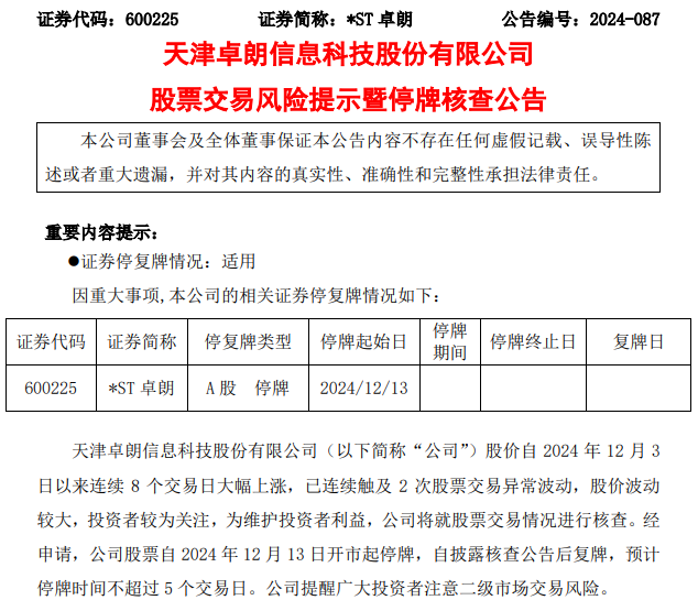 12月13日,连续8个交易日实现涨停的*ST卓朗停牌。