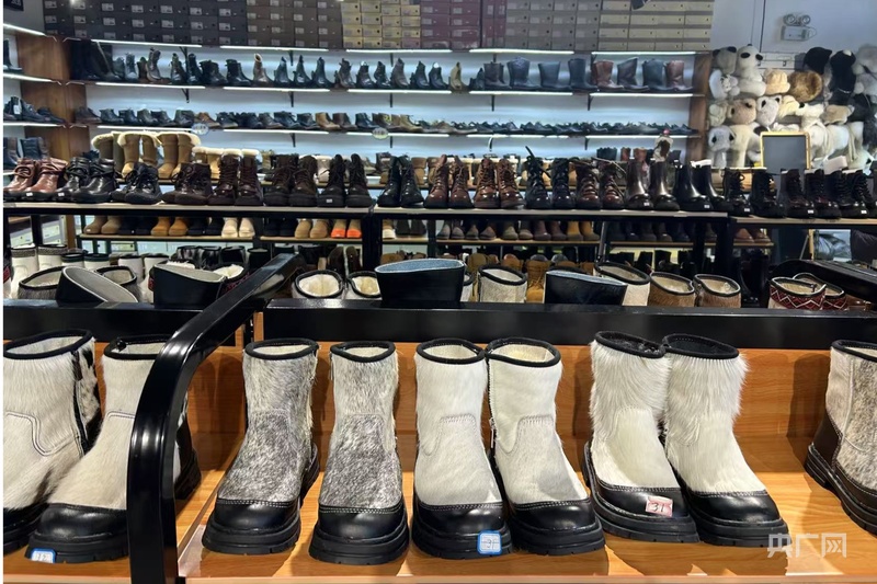“乐享冰雪”成为人们的运动新风尚,防寒保暖更是必不可少。呼伦贝尔鄂温克旗民族文化产业创业园的店面里,民族服饰、文创产品、皮艺手工,琳琅满目的商品匠心独具。北方地区严寒,人们生产生活必备羊毛、马毛等材质的高筒靴,其具有防寒、耐磨和舒适的特点。如今,当地人将防寒保暖功能与现代工艺相结合,消费者对时尚马毛靴的认可度不断攀升,“来上一双马毛靴,防滑又耐寒”成为共识,牧民们生产劳动的手工毛靴成为了游客的特色伴手礼。