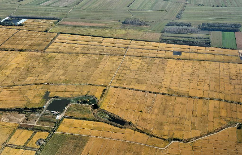 俯瞰黑龙江省哈尔滨市一处稻田(10月2日摄,无人机照片)。新华社记者孙晓宇摄