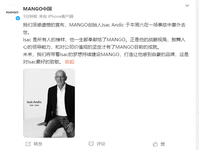 12月15日下午,时尚品牌@MANGO中国 官博发文表示,MANGO创始人Isac Andic于本周六在一场事故中意外去世。