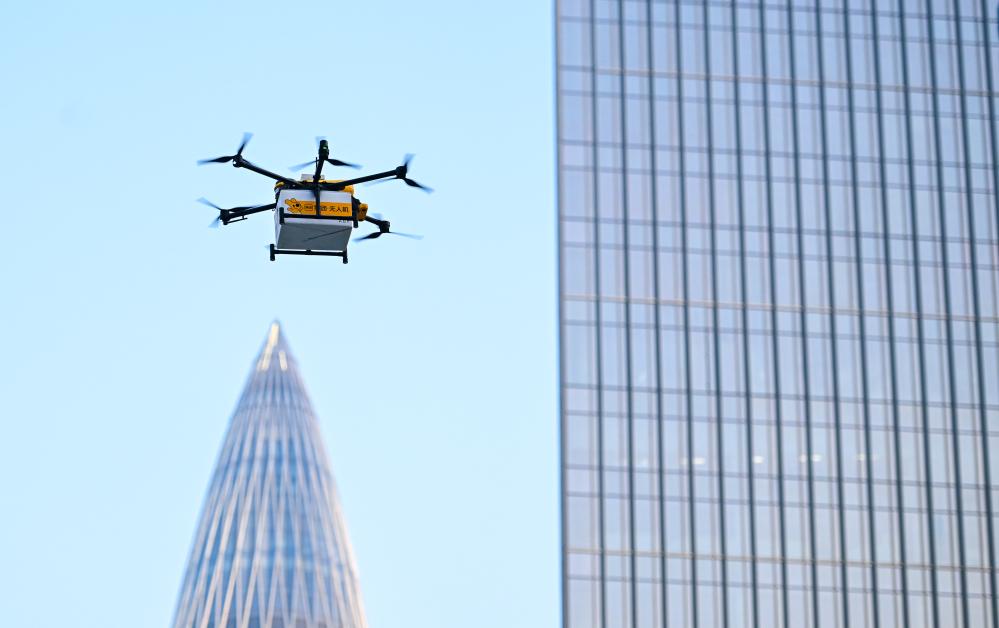 送餐无人机穿行在深圳市后海片区的楼宇之间。新华社记者 毛思倩 摄