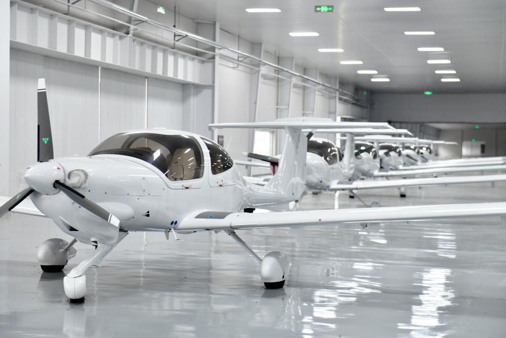 10月9日,在滨州市大高航空高新产业园,钻石DA40飞机被整齐停放在机库里。新华社记者 郭绪雷 摄