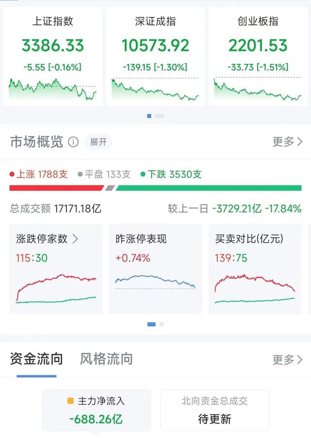 12月16日,A股三大指数收跌。截至收盘,上证指数报3386.33点,跌0.16%;深证成指报10573.92点,跌1.30%;创业板指报2201.53点,跌1.51%。市场上1788只个股上涨,3530只个股下跌,成交1.71万亿元。较前日缩量3729亿元。