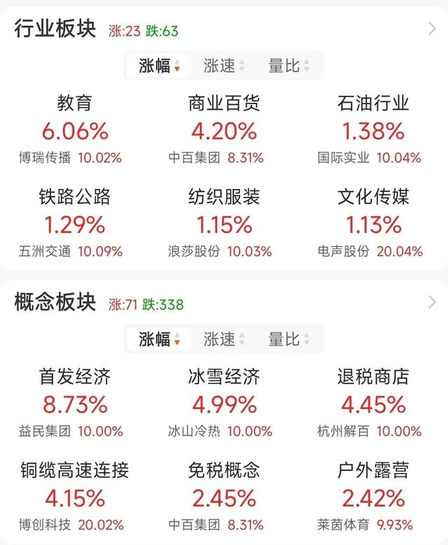 市场全天震荡走低,创业板指领跌,高位股开始出现退潮,建设工业等多股上演“天地板”,此外中百集团等多只高位股尾盘炸板。盘面上除了大消费外没有特别强势的热点,但仍有逾百股股涨停或涨超10%。从板块来看,大消费股持续爆发,零售、冰雪产业、养老等多个方向大涨。铜缆高速连接概念股震荡走强,沃尔核材涨停再创历史新高。下跌方面,机器人概念股展开调整,五洲新春跌停。板块方面,冰雪产业、铜缆高速连接、零售、养老概念等板块涨幅居前,游戏、半导体、消费电子、人形机器人等板块跌幅居前。