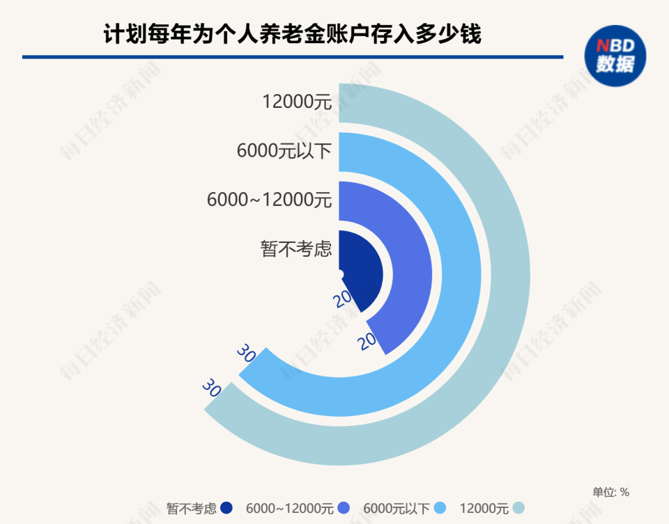 在计划每年为个人养老金账户存多少钱方面,三成选择了12000元,还有约三成选择了6000元以下,仅有两成的人选择了6000元~12000元,约两成则选择了暂不考虑。这意味着,虽然一些上班族了解个人养老金对于节税和未来养老的作用,但是对于缴费的态度却呈现出两级分化的状态。