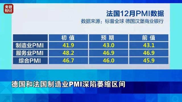 周一欧元区主要经济体德国和法国12月采购经理人指数(PMI)出炉。德国综合PMI回升至47.8,但仍低于50荣枯线,表明德国经济仍处于萎缩状态。尽管服务业活动出现小幅回升,但制造业产出却急剧下降,为三个月新低。这主要由于新订单大幅减少,需求疲软导致。此外,法国服务业收缩速度有所放缓,制造业则受到严重冲击,PMI降幅为四年半以来最大。